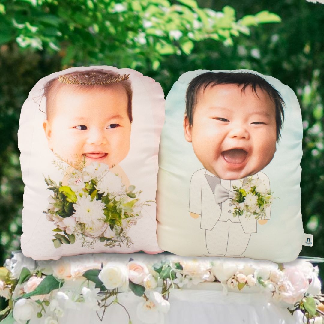 ¥28,600→¥27,250(税込・送料込)赤ちゃんの頃のお顔写真をあしらった、顔ハメタイプのミニウエディングウエイトクッション。