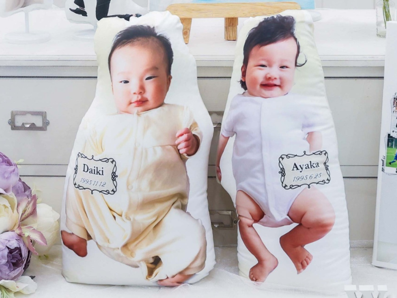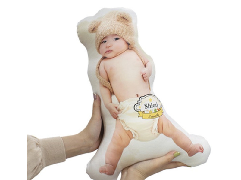 赤ちゃんの頃の写真と出生時の体重を再現したオーダーメイドクッションをお届けします。